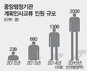 24일 안전행정부에 따르면 지난해 정부의 ‘계획인사교류’ 인원은 총 690명에 이르렀다. 전년의 238명에 비해 3배에 가까운 규모로, ‘부처 간 칸막이 해소’를 강조하고 있는 현 정부의 의지가 반영된 결과다. 안행부는 올해 인사 교류 규모를 두 배 가까이 늘린 1300명으로 계획하고 있으며, 2015년에는 2000명까지 확대하기로 했다.