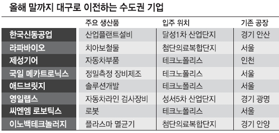 한국신동공업을 시작으로 본사와 공장을 대구로 이전하는 기업이 연말까지 8개나 된다. 인천의 자동차 부품 업체인 제성기어가 오는 5월 대구테크노폴리스로 이전한다. 서울의 치아 보철물 생산 업체인 라파바이오도 대구 첨단의료복합단지로 이전할 예정이다. 대구시는 이들 기업의 이전으로 1200억원 규모의 신규 투자와 540여명의 일자리 창출 효과가 있을 것으로 기대한다. 김종찬 대구시 투자정책관은 “수도권에 있는 우량 기업을 유치해 지역의 고용을 창출할 수 있고 연관 산업의 동반 상승도 가능해졌다”고 말했다.