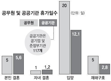 공공기관들이 개인 경조사에는 공무원보다 후한 휴가를 주면서도 자연재해 지역 주민을 돕도록 하는 ‘재해구호 휴가’는 공무원보다 적은 것으로 나타났다. 자녀 결혼에 최대 5일에 달하는 휴가를 주는 것보다 사회적 책임을 위한 휴가나 모성휴가 등을 보장하는 쪽으로 바꿔야 한다는 목소리가 나온다.