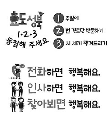효도 성북 1·2·3은 ‘1주일에 두 차례 이상 경로당(혹은 부모님)을 방문해 안부를 확인하고 삼시 세끼를 챙겨 드려 굶는 어르신이 없도록 하자’는 내용을 담았다.