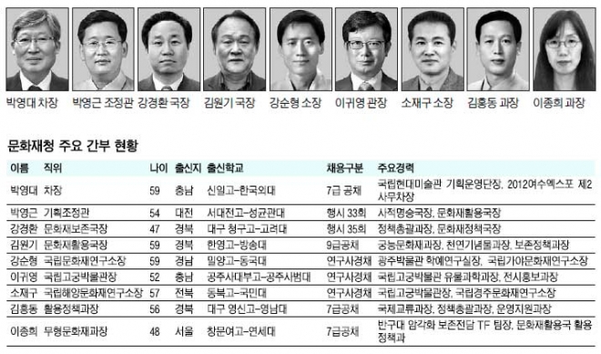 최고참은 박영대(59) 차장이다. 1980년 4급 을류(7급) 공채로 공직에 발을 디뎠다. 한국외국어대 중국어과와 타이완 중흥대 석사, 중국대사관 외교관 등을 거쳐 한·중 관계사에 조예가 남다르다. 국립현대미술관과 2012여수엑스포, 국립중앙도서관 등 다양한 업무를 경험한 행정통이다. 성격이 온화하고 합리적이란 평가를 듣는다. 박 차장은 “지난 10년간 지정문화재가 20% 이상 늘었으나 조직과 기능은 답보 상태라 업무의 질을 높일 수 없다”며 아쉬움을 토로했다.
