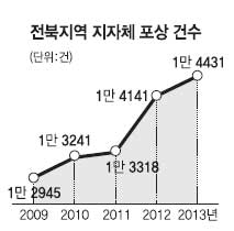 전북지역의 경우 지난해 도와 14개 시·군, 지방의회 등에서 준 포상은 1만 4431건에 이른다. 이 같은 전북지역 지자체와 지방의회 포상 건수는 최근 5년 동안 가장 많은 것이다. 실제로 익산참여연대가 도내 지자체와 지방의회로부터 제출받은 연도별 포상 자료에 따르면 2009년 1만 2945건이던 포상이 2010년 1만 3241건, 2011년 1만 3318건, 2012년 1만 4141건, 지난해 1만 4431건 등으로 해마다 늘었다.