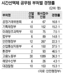 부처별로 감사원이 4명 선발에 310명이 지원, 최고 경쟁률인 77.5대1을 기록했다. 이어 국방부가 2명 모집에 105명이 지원해 52.5대1, 교육부가 10명 모집에 511명이 지원해 51.1대1을 나타내는 등 인기를 누렸다. 시간제 공무원을 58명으로 가장 많이 뽑는 경찰청은 1396명이 지원해 경쟁률이 24.1대1이었으며, 30명을 뽑는 고용노동부는 36.3대1이었다.