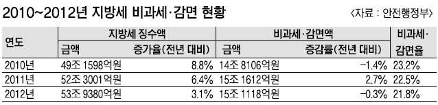 6일 안전행정부에 따르면 정부는 부동산 경기 하락 등으로 지방세 수입이 줄고 있는 상황에서 비과세·감면 혜택은 도리어 증가하는 사태를 막고자 ‘2011~2015년 지방세 감면 재원 중기운용계획’을 2010년 수립했다. 안행부는 당시 22.0%였던 지방세 비과세·감면율을 매년 단계적으로 줄여 2015년에는 국세 수준인 13.9%까지 낮추겠다는 목표를 제시한 적이 있다.