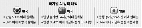 반면 5차례 AI가 발생한 일본은 발생 농가에 한해 24시간 안에 살처분하고 반경 3㎞ 이내 가금류 농장에 대해 이동 제한을 하고 있다. 미국도 AI가 발생하면 해당 농장만 24시간 안에 살처분하고 2마일(3.2㎞) 반경 위험지역 가금류는 정기적으로 모니터링하도록 규정하고 있다.
