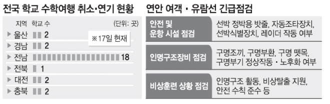 또 울산 H 여고는 2학년생 380명을 대상으로 다음 달 20일부터 23일까지 뱃길을 이용한 제주도 수학여행을 추진했으나 이번 사고로 전면 취소했다. 울산지역 D 초등학교 2곳도 배편으로의 제주도 수학여행을 취소했다. 충북 충주의 한 고등학교는 항공편으로 제주도에 수학여행을 간 뒤 배로 마라도관광을 할 계획이었으나 취소했다. 충북 보은의 한 고등학교도 거제도에서 배로 가는 외도 관광을 취소했다. 광주·전남·경기·대전·충남 등 전국 대부분 교육청도 뱃길을 이용한 수학여행을 재검토할 예정인 것으로 알려졌다.