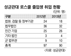 지난해 성대 로스쿨 출신의 변호사시험 합격자 역시 같은 취업 양상을 보였다. 합격자 100명 중 90명이 취업을 했는데 이 중 32명(35.6%)이 법무법인에, 26명(28.9%)이 민간 기업에 진출했다.