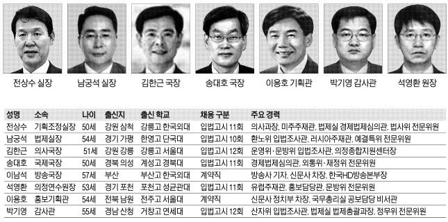 석영환 의정연수원장은 차분하고 원만한 일 처리에 매너 좋은 신사여서 따르는 후배들이 많다. 실·국장들의 주류인 입법고시 11회 중 한 명이다. 이용호 홍보기획관은 신문사 정치부에서 국회를 오래 출입해 국회와 언론을 잘 이해하는 언론인 출신이다. 김종필 전 총리 때 총리 공보실 과장으로 공직에 입문했고 1400여명에 달하는 국회 출입 기자들과 소통하는 자리에서 일하고 있다.