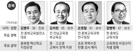 충북도교육감 선거는 진보성향인 김병우 전 충북교육발전소 상임대표가 선두를 달리고 있고, 보수 성향인 김석현 전 전남도교육청 부교육감, 손영철 전 충북교육과학연구원장, 장병학 현 충북도 교육의원이 추격하는 양상이다.