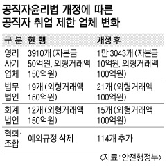 국무회의를 통과한 공직자윤리법 개정안은 국회에 제출되며 공직자윤리법시행령 개정안은 오는 25일 공포돼 즉시 시행될 예정이다. 시행령 개정안은 그동안 취업심사의 사각지대였던 조합이나 협회를 포함해 퇴직 공직자가 국가기관의 감독 기능을 무력화하는 것을 막는 내용을 담았다.