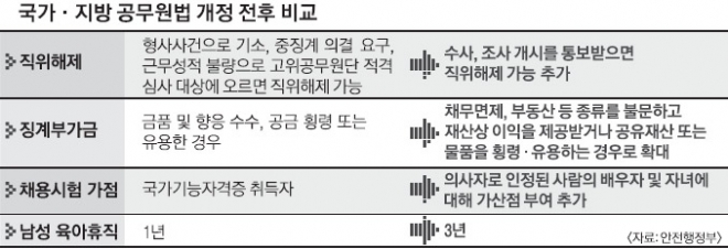 앞으로 사회적으로 물의를 빚은 비위 공무원은 검찰과 경찰의 수사나 감사원의 조사 통보를 받는 즉시 직위해제 조치를 받는다. 또 부당하게 재산상의 이득을 취한 공무원에 대해서는 비위 종류를 불문하고 수수액 등의 최대 5배인 징계부가금이 부과된다.