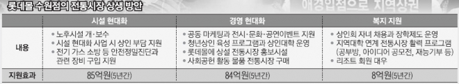 시설 현대화 지원의 경우 지역 22개 전통시장의 노후화된 시설을 개·보수하거나 신규로 설치할 수 있도록 올해 40억원, 내년에 30억원 등 모두 70억원을 현금 지원하기로 했다. 또 경영 선진화를 위해 전통시장 청년상인 육성 프로그램을 통해 우선 12개 점포의 창업을 지원하고 우수 창업자에 대해 향후 롯데몰을 통해 판로 확대를 지원할 계획이다.