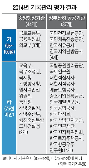 국가기록원은 “특별지방행정기관의 경우 기록물 관리 전문 요원을 배치하지 않는 등 인프라가 미흡해 기록물 이관, 평가, 폐기 등 기본적인 관리 업무가 원활하지 않았다”면서 “중앙행정기관과 시·도교육청은 평균 점수가 각각 81.5점, 84.9점으로 기록 관리 업무가 정착 단계에 접어들었지만 특별지방행정기관, 교육지원청, 정부 산하 공공기관은 전반적으로 개선될 필요가 있다”고 평가했다.