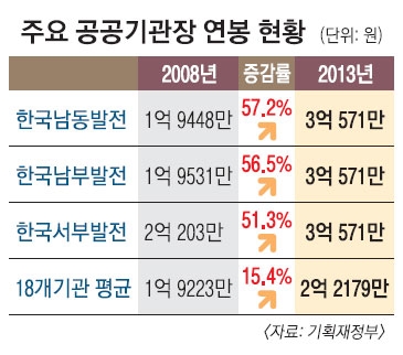 16일 기획재정부가 이한구 새누리당 의원 등에게 제출한 18개 중점관리기관 기관장 연봉 현황 자료와 공공기관 알리오 등에 따르면 남동발전 기관장 연봉은 1억 9448만원에서 3억 571만원으로 1억 1123만원이나 올랐다. 증가율은 57.2%로 전체 중점관리기관 중 가장 높았다. 연평균 증가율만 10%에 육박하는 셈이다.