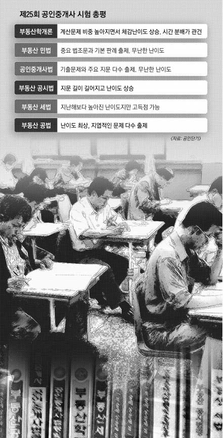 ‘계산 문제 비중이 높아져 체감 난이도가 상승한 부동산학개론, 지적제도 문제가 어렵게 출제된 부동산 공시법, 최근 5년 가운데 가장 높은 난이도였던 부동산 공법.’ 지난 26일 치러진 ‘제25회 공인중개사 자격시험’에 대해 수험가에서는 부동산학개론, 부동산 공법이 어렵게 출제됐다는 평이 나왔다. 공인중개사 자격시험은 매년 한 차례 1·2차 시험이 같은 날 동시에 치러진다. 수험생들은 1차만 지원한 뒤 다음해 2차 시험을 볼 수 있고, 1·2차를 동시에 지원해 한번에 합격을 노릴 수도 있다. 과목별 40점 이상 전 과목 평균 60점 이상이 돼야 합격의 영광을 안을 수 있다. 모두 12만 60명이 응시한 이번 시험의 특징을 공인단기 강사들의 도움을 받아 분석했다.