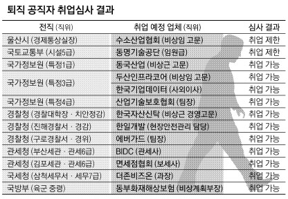울산시 경제통상실장(지방2급)은 한국수소산업협회 비상임고문으로 가려 했으나 취업 제한에 발목이 잡혔다. 국토부 국토교통인재개발원 교육과의 시설5급 공무원도 ㈜동명기술공단 종합건축사무소에 임원급으로 취직하려고 신청서를 냈지만 역시 취업 제한 조치에 묶였다. 퇴직 전 5년간 소속 부서와 취업 예정 기관 사이의 밀접한 관련성이 확인됐기 때문이다. 반면 경남 진해경찰서 경감, 서울 구로경찰서 경위, 관세청 부산세관 부두통관3과 관세6급, 김포세관 휴대품과 관세6급, 국세청 삼척세무서 세원관리과 세무7급, 국방부 육군 중령은 심사를 통과했다. 관세청 출신 2명은 과거 업무와 맞닿은 물류기업 관세사, ㈔한국면세점협회 보세사 자리를 꿰찼다. 경찰대학장을 지낸 신청자는 한국자산신탁㈜ 비상근 경영고문으로 일하게 됐다.