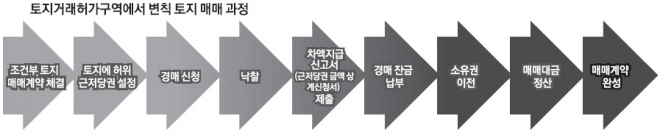 토지거래허가구역에서 경매를 악용한 변칙 부동산 투기가 활개를 치고 있다. 정부는 1978년부터 땅값이 급등하거나 투기 우려가 있는 지역을 허가구역으로 묶어 매매할 때 지방자치단체장의 허가를 받도록 했다.