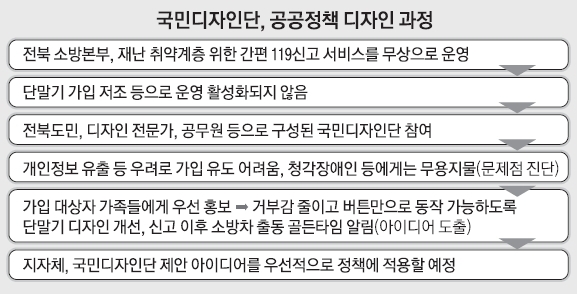 그러나 정책 설계 과정에서 공무원들만의 노력으로는 신고를 위한 단말기 보급이나 가입자 유도 등이 쉽지 않았다. 지난 7월부터 전북도청은 공무원은 물론 정책 수요자인 취약계층을 포함한 전북도민과 서비스디자인 전문가도 정책 설계에 참여하도록 했다. 이들은 3개월 동안 수요자 조사와 치열한 토론을 한 끝에 서비스 홍보수단을 개선하고 단말기 기능을 사용자 중심으로 개선해야 한다는 결론을 내렸다.