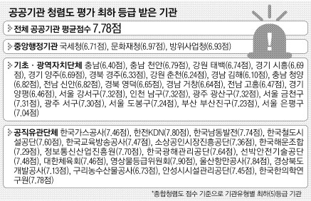 이 밖에도 열량제 프로젝트 비리 등 부패사건이 다수 발생한 한국가스공사(7.46점), 입법로비·납품비리 등으로 본사 처장급이 전원 교체된 한전KDN(7.80점), 금품비리가 발생하고 임직원 친·인척에게 내부 자리를 내주는 등 몰상식한 행위로 비판받은 한국광해관리공단(7.64점)도 가장 낮은 등급이 매겨졌다.