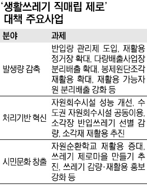 처리기반 혁신 분야에서는 2017년까지 기존 자원회수시설을 하루 150t까지 처리 가능하도록 개선한다. 소각 여유 용량이 있는 양주·이천시의 자원회수시설을 함께 쓰고 소각과정에서 발생하는 소각재도 재활용하기 위해 2017년부터 시설을 구축한다. 또 이달 중순 ‘쓰레기 함께 줄이기 시민운동 본부’를 발족하고 생활쓰레기 직매립 제로 추진과 관련한 종합적인 컨트롤타워를 맡는다.