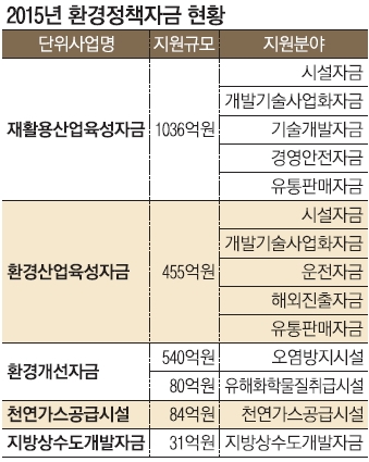 사업별로는 재활용산업육성자금 1036억원을 비롯해 환경개선자금(620억원), 환경산업육성자금(455억원), 천연가스공급시설설치자금(84억원), 지방상수도개발자금(31억원) 등이다. 특히 재활용산업육성자금은 지난해 750억원에서 38.1%, 286억원 증가했다. 재활용산업 성장에 따라 현장의 자금 수요가 많다는 점이 반영됐다. 이에 따라 국내 재활용업체의 창업과 설비투자 확대 및 재활용산업 활성화, 폐기물 재활용 촉진이 기대된다.
