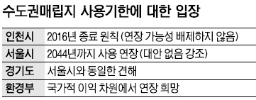 인천시는 수도권매립지 조성 당시 계획대로 2016년 사용 종료 원칙을 고수하고 있는 반면, 서울시와 경기도는 현 매립지 처리량이 총 처리 가능 용량의 58%에 불과한 데다 대체매립지 마련이 현실적으로 불가능하다며 사용기한을 2044년까지 연장할 것을 주장하고 있다.