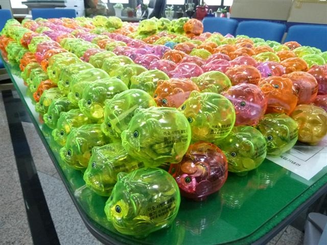 지난 12일 저금통 전달식이 끝나고 주민센터 직원들의 즐거운 고생(?)이 시작됐다. 모여 앉아 690개의 돼지저금통의 배를 칼로 가르기 시작했고 꼬박 3시간이 걸렸다. 은행에 동전을 가져가 분리하고 정산하는 데만 4시간이 걸렸다. 기부액은 270여만원이었고 아이들은 2012년과 2013년에도 각각 133만원, 308만원을 기증한 바 있다.
