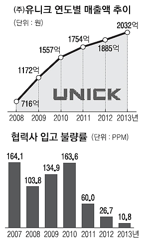 경영난을 겪는 협력사에 직접 자금을 지원하고 설·추석 등 명절에는 협력업체의 자금난 완화를 위해 납품대금을 조기 지급한다. 올해 기업은행과 ‘동반성장협력 대출’ 상품도 개설했다. 유니크가 20억원을 예치하고 추천 기업에는 시중보다 낮은 특별금리를 적용함으로써 협력사의 자금 조달 숨통을 터 줬다. 상생 노력은 제품의 품질 향상으로 나타났다. 2007년 100만개당 164.1개(164.1)에 달했던 협력사 입고 불량률은 2013년 10.8으로 크게 낮아졌다. 우수한 품질로 수요가 증가하면서 유니크뿐 아니라 협력업체 매출도 동반성장했다.