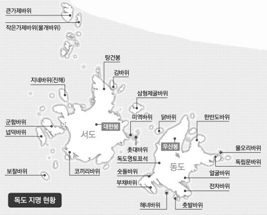 동도와 서도 등 2곳의 큰 섬과 88곳의 암초 및 바위 등으로 이뤄진 독도에서 지금까지 지명이 붙여진 것은 육상 29곳, 해저 11곳 등 모두 40곳이다. 정부와 경북도 등은 이 같은 지명 고시와 함께 국가기본도 및 각종 포털 사이트, 지도책과 교과서 등에 공식 사용하고 홍보할 계획이었다.