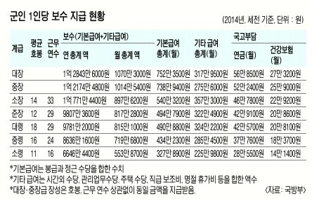 국방부가 13일 공개한 ‘2014 국방통계연보’에 따르면 대령의 평균 연봉(세전)은 근무 연수 29년 기준 약 9781만원, 중령 8636만원(24년), 소령 6646만원(16년)으로 집계됐다. 이는 기본 급여를 비롯해 상여금, 각종 수당, 교통비 등을 포함한 수치다. 대장과 중장을 제외한 군 간부의 연봉은 호봉과 근무 연수에 따라 달라진다.