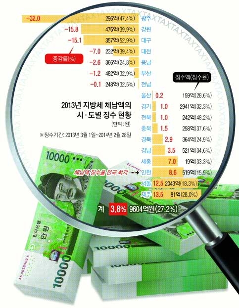 지자체는 지난해 9604억원의 체납지방세를 거둬들였지만 낮은 징수율과 악성 체납 증가로 누적 체납액은 1년 만에 1333억원(3.8%) 정도 늘어났다. 2013년 체납액은 3조 5373억원 규모였다.