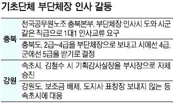 강원도 역시 비슷한 상황이다. 속초시가 인사적체 해소 등을 이유로 지난달 24일 김철수 시 기획감사실장을 부시장으로 자체 승진시키자 강원도가 보조금을 삭감하고 시 공무원들에 대한 도지사 표창장을 보내지 않는 등 강력 대응에 나섰기 때문이다. 전공노 강원지역본부는 “인사권은 해당 단체장의 고유 권한인데 강원도가 이번 인사를 빌미로 보복을 취하는 것은 기득권을 지키기 위한 망동”이라며 “관행적으로 강원도가 쥐고 있던 인사권의 형평성을 되찾을 수 있도록 투쟁에 돌입하겠다”고 반발하고 있다.