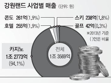 이 밖에 호텔 255억원(1.9%), 콘도 261억원(1.9%), 스키 238억원(1.8%), 골프 42억원(0.3%)이었다. 카지노에서는 3986억원의 이익이 났지만 호텔·콘도·스키 분야는 대부분 적자를 기록했다. 적자 내역은 호텔 80억원, 콘도 157억원, 스키장 178억원이다. 이는 카지노를 바탕으로 주변 관광산업이 커져 지역 경제에 득이 될 것이라는 기존의 주장을 뒤집는 결과다.