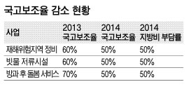 이 때문에 지자체들은 국고보조가 줄어든 만큼 지방비를 부담하느라 허리가 휠 지경이다. 전북도의 경우 재해위험지역 정비에 89억원, 빗물 저류시설에 20억원, 방과 후 돌봄 서비스에 38억원 등 147억원을 추가로 부담해야 한다. 타 시·도 역시 한 해 150억~200억원의 추가 부담액이 발생했다.
