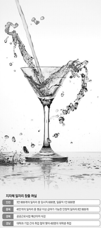 충북도는 민선 6기 동안 40만개의 일자리를 창출한다고 발표했지만 이 가운데 평균 이상의 급여, 4대보험 혜택, 연간 280일 이상 근무 등이 가능한 안정적인 일자리는 8만 8000개뿐이다. 나머지는 숲가꾸기 등 생계형 일자리가 대부분이다. 충북도 관계자는 “기업들이 채용의 문을 닫고 있는 상황에서 공공근로 등도 무시할 수 없어 일자리에 포함시키고 있다”면서 “앞으로 기업유치, 취업박람회, 일자리지원센터와의 연계 등을 통해 자존감 있는 일자리 창출에 주력할 방침”이라고 밝혔다.