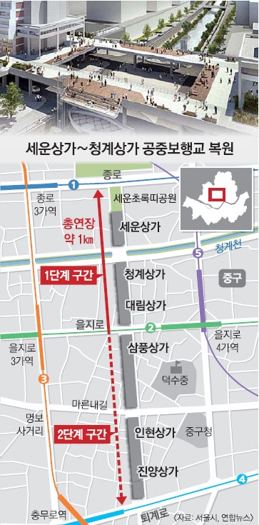 시가 내놓은 활성화 계획을 살펴보면 먼저 청계천 복원 당시 철거됐던 세운상가 가동과 청계상가 사이의 공중 보행교가 복원된다. 보행교 디자인은 청계천 경관을 고려해 미적 수려함과 기능이 담보될 수 있게 전문가를 대상으로 국제 공모할 계획이다. 시는 5월까지 국제 현상설계 공모를 마치고 1단계 구간을 올 11월 착공해 내년 말까지 마칠 예정이다
