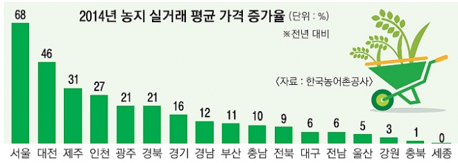 서울의 농지는 과수원을 빼면 지난해 480㏊로 전년 대비 23.7% 줄었다. 농지 감소율은 2012년 2.5%, 2013년 22.1% 등으로 증가하는 추세다. 어명소 국토교통부 토지정책과장은 “노원구 공릉동 육군사관학교를 지나면 농지가 많은데 건설업자들이 아파트를 짓고 싶어 군침을 흘리는 지역”이라면서 “서울 시내의 농지가 다른 용도로 개발돼 땅값이 오를 것을 기대하고 투자하는 사람들이 늘고 있다”고 밝혔다.