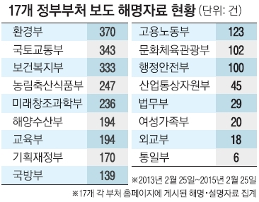 4일 서울신문이 각 부처 홈페이지에 게시된 자료를 토대로 박근혜 정부 출범 2년간(2013년 2월 25일~2015년 2월 25일) 보도 해명 건수를 집계한 결과 17개 부처에서 모두 2669건의 해명자료를 낸 것으로 확인됐다. 정부 출범 이후 해명자료를 가장 많이 낸 곳은 환경부(370건)로, 1년 평균 185건이나 된다. ‘이틀에 한번꼴’이다. 국토교통부(343건)와 보건복지부(333건)가 낸 보도 해명도 300건이 훌쩍 넘었다.