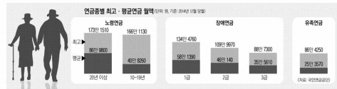 지난해에는 375만명이 유족·장애 연금 등을 포함해 총 13조 7799억원의 국민연금을 받았으며, 시·도별 수급현황을 보면 서울(69만명)이 2조 8339억원으로 가장 많았고, 경기도가 2조 8155억원으로 그 뒤를 이었다. 1인당 연간 지급액은 울산지역이 연 483만 2000원으로 가장 많았다. 2014년 12월 말 현재 100세 이상 연금 수급자는 33명이며, 이 중 최고령자는 전남 나주시에 사는 104세의 B씨다. 국민연금공단은 올해 총 415만명의 수급자가 매달 1조 3823억원씩, 총 16조 5875억원의 국민연금을 받을 것으로 예상했다. 또 2025년에는 수급자가 629만명에 달할 것으로 전망했다.