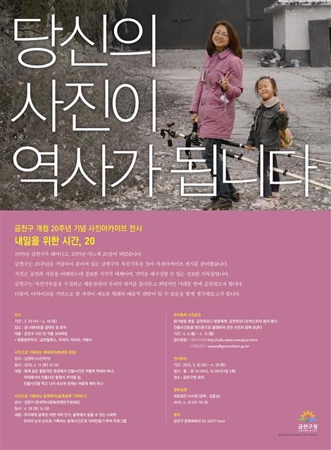 구는 개청 20주년을 맞아 이달 25일부터 다음달 18일까지 금나래아트홀갤러리와 구청 로비에서 사진아카이브전 ‘내일을 위한 시간, 20’을 개최한다고 24일 밝혔다. 구 관계자는 “개청 20년을 맞아 대형 행사를 기획하자는 의견도 있었지만, 행사보다 지난 20년을 돌아보고 우리가 지켜야 할 가치가 무엇인지에 대해 생각하는 기회로 삼아야 한다는 의견이 많아 사진전을 준비하게 됐다”고 설명했다.