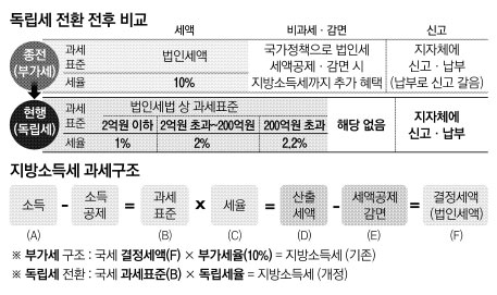 법인세는 국세이고 과세표준에 따라 세율 10~22%를 적용한다. 하지만 기업이 이만큼 법인세를 내지는 않는다. 세금을 아예 면제(비과세), 또는 일부만 내도록(감면) 하는 각종 특혜 조항이 있기 때문이다. 기존에는 비과세·감면을 적용한 뒤 기업이 실제 납부하는 세금(결정세액)에서 10%를 떼어 지방에 배분했다. 반면 새 제도는 비과세·감면을 적용하지 않은 상태에서 지방세 기준 법인세율(1~2.2%)을 지자체가 부과하도록 한다.