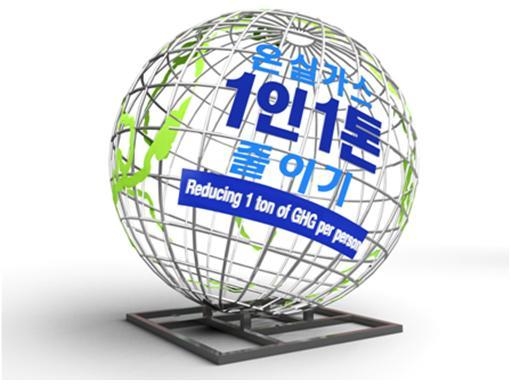 ‘온실가스 1인 1t 줄이기’ 운동에 시민들이 동참하길 촉구하는 초대형 지구본이 3일 서울시청 광장에 설치된다. 지름 4.7m, 높이 5m의 조형물로, 지구본 양면에는 ‘온실가스 1인 1t 줄이기’라는 문구가 적혀 있다.