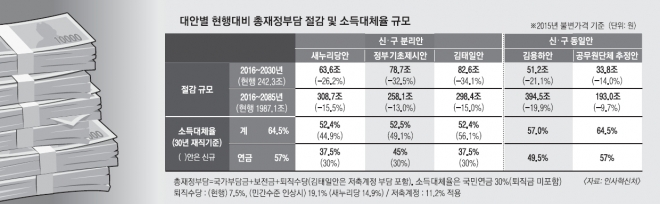 향후 15년(2016~2030년) 동안 총 재정부담 절감 수준을 비교해 보면 김태일 교수 제안이 83조원으로 가장 큰 폭이었고 정부기초제시안이 79조원으로 뒤를 이었다. 반면 2016년부터 2085년까지 앞으로 70년간 총 재정부담 절감 수준을 보면 15년간 절감 수준이 51조원으로 상대적으로 낮았던 김용하 교수 제안이 395조원으로 가장 높았다. 김 교수 안은 신·구 공무원 모두 수지균형적 수급구조로 개혁하는 내용이기 때문이다.