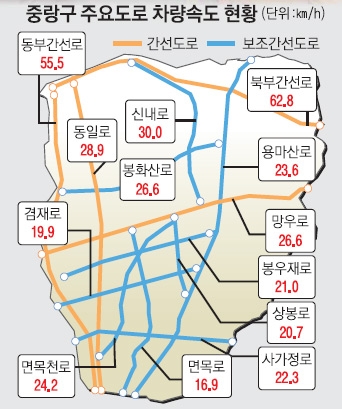 차량 정체는 철도 이용이 적은 탓도 있었다. 철도의 교통수단 분담률은 20.6%로 시 평균(38.2%)보다 크게 낮았다. 또 전체 교통량 중에 버스 이용이 25.8%로 도시철도(14.0%)보다 월등히 많았다. 반면 통행 방향은 강남(14.8%)과 종로 등 도심(13.8%)이 거의 비슷했다. 구 관계자는 “도심 방향은 주로 버스를, 강남 방향은 주로 지하철을 이용해 출퇴근을 하는 경우가 많았다”면서 “이를 볼 때 신내동에서 청량리 간 경전철 등 도심 방향으로의 지하철 확충이 필요하다”고 설명했다.