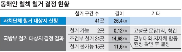 국방부가 철거를 동의한 지역은 고성군 문암1·청간 등 2개 구간으로 사업비만 확보되면 올해 안에 철거가 가능하다. 반면 조건부로 동의된 구간은 군부대와 시·군의 합동 현장 확인을 거쳐 철거 여부와 시기가 결정될 예정이다.