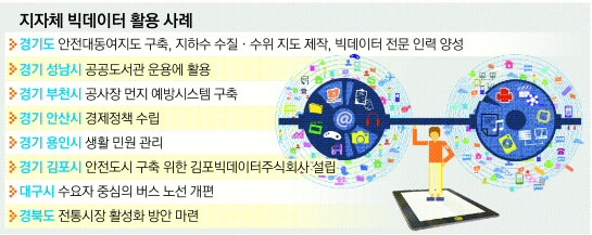 경기 부천시는 최근 5년간 접수된 비산먼지 민원 688건을 분석한 후 유형별로 9개 구역으로 벨트화해 맞춤형 예방 시스템을 만들었다. 경기 안산시는 침체된 지역 경제를 살리기 위해 빅데이터 관련 민간 기업과 손잡고 정책을 수립한다. 이를 위해 KT는 주요 지역의 휴대전화 통화 사용량을, BC카드는 소비 데이터를 분석한 후 세월호 사고 전후 업종 및 지역별 소비 침체 정도와 유동인구 변화 등에 대한 분석 결과를 시에 제공한다.