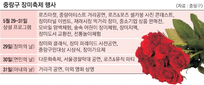 축제는 일자별로 장미의 날, 연인의 날, 아내의 날 등 3개의 주제로 펼쳐진다. 29일 장미의 날에는 장미퍼레이드로 축제의 시작을 알린다. 장미요정, 장미기사단, 육사군악대 등 20개 팀이 오후 4시 30분부터 6시까지 장미터널을 따라 행진한다. 퍼레이드의 종착점인 중화둔치체육공원에서 중랑구민대상 시상식이 열리며 오후 7시 30분부터는 장미가요제가 열린다.