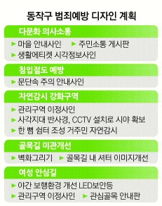 동작구는 신대방16가길 12 일대가 법무부의 범죄예방 환경개선사업 추진지역으로 선정돼 2억원을 지원받는다고 27일 밝혔다. 이에 따라 구는 이 지역에 범죄예방디자인을 도입, 올 하반기까지 안전마을로 탈바꿈시킬 예정이다. 신대방1동은 구로구 가리봉동, 영등포구 대림동 등지에서 포화상태를 이룬 외국인들이 꾸준히 유입돼 현재 외국인 가구 비율이 9.03%에 달한다. 이는 서울시 476개 행정동 가운데 25위에 달하는 수치다. 낡은 건물의 비율도 높다. 전체 주택의 84%가 다세대·다가구 주택으로 이루어져 있으며, 20년 이상 된 낡은 건물이 82%를 차지하고 있다. 범죄 우려가 있는 막다른 길이 12곳, 사각지대도 4곳이 있다. 이러한 지역적 여건과 관련해 이 지역의 최근 3년간 주요 범죄 발생률은 증가 추세다. 특히 절도와 같은 생계형 범죄는 2012년에 비해 2014년에는 13%가 증가했다. 무단투기 등 기초질서 위반 사례도 늘어 해당 동 주민센터에서 단속에 어려움을 겪고 있기도 하다.