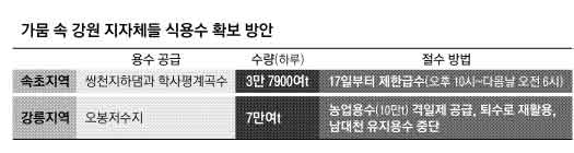 속초지역에는 지난달부터 지금까지 강수량이 지난해 대비 36% 수준에 불과해 식수 공급에 차질을 빚으면서 17일부터 심야시간 제한급수 실시를 선언했다. 이는 시민의 주요 취수원인 쌍천이 말라붙으며 물이 고갈되고 있기 때문이다. 인구 8만 2000명의 속초시는 1998년 쌍천 하류에 물을 저장할 수 있는 길이 832m의 지하 댐을 설치해 생활용수의 90% 정도를 공급받고 나머지 10%가량은 학사평 계곡물을 정수해 충당하고 있다. 하지만 이달 들어 하루 평균 급수 공급량이 3만 7900여t으로 하루 최대량인 3만 8400t에 근접하며 비상이 걸렸다. 시는 마침내 이 같은 상황이 더 이어지면 수돗물 공급량이 부족해질 것으로 판단해 비상조치를 가동하게 됐다.