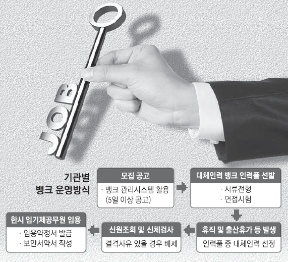 대체인력 뱅크가 구직자와 정부 부처에 좋은 결실을 안기고 있다. 육아휴직·출산휴가 등으로 결원될 직위에 대해 공백을 메워야 할 경우 미리 선발한 인력 중 한시임기제 공무원을 임용해 업무를 대행하도록 하는 제도다. 16일 인사혁신처에 따르면 2010~2013년 활용 실적은 국세청 1003명, 고용부 887명, 통계청 184명 등 39개 중앙행정기관에 모두 2847명이다.